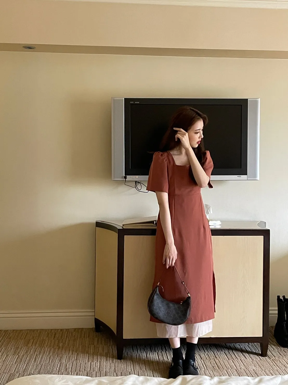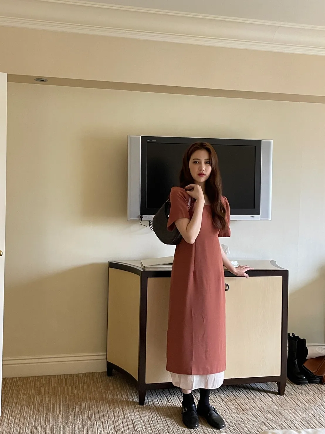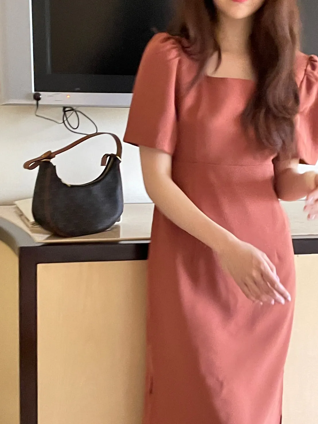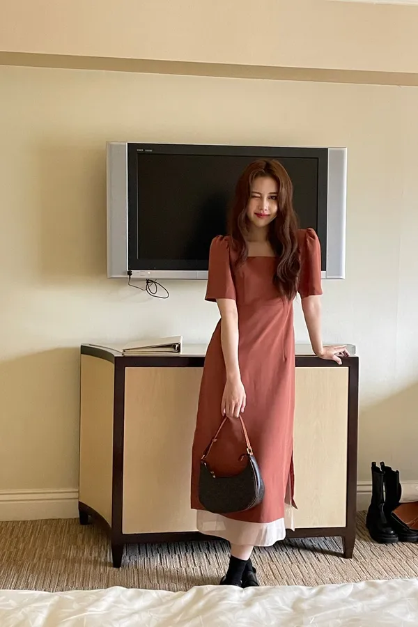 現貨!- LAB.B - 布拉格女孩的拼接設計修身洋裝-蜜糖橘
