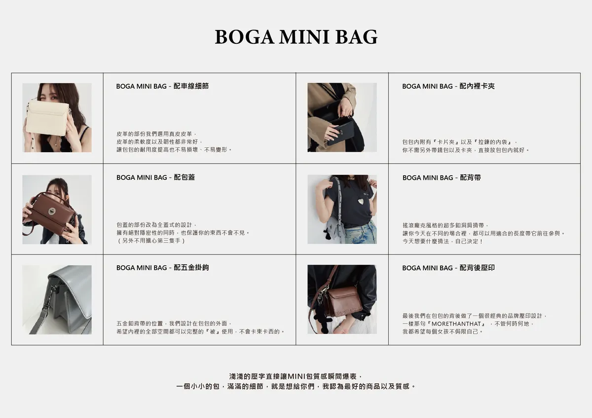 關於boga mini bag 我以前很鄙視小包的,因為我覺得小包根本什麼屁都不能裝,但後來發現小包其實有分很多種,有些是 重看不中用,有些則是『重看也很實用』 而我們這次的mini包就是追求後者。這款的靈感來源是一個韓國的小包,韓國姊姊一開始送給我一顆韓國小包(價值5000多元),我被他的大容量驚嚇到,真的沒想過小包居然可以裝這麼多東西,所以當我們決定開發自己的小包時,我們就是以『它』的容量來做我們小包開發的基本設定,並修改了皮革、包蓋,以及五金釦背帶的位置,以及背後的壓印,細節上多了很多專屬於我們的設計。*皮革的部份我們選用真皮皮革,皮革的柔軟度以及韌性都非常好,讓包包的耐用度提高也不易損壞、不易變形。最後我們在包包的背後做了一個很經典的品牌壓印設計,一樣那句『morethanthat』 ,不管何時何地,我都希望每個女孩不侷限自己。淺淺的壓字直接讓mini包質感瞬間爆表,一個小小的包,滿滿的細節,就是想給你們,我認為最好的商品以及質感。這個包非常適合大家出國帶上,長期國外工作的我發現,擁有一顆不廢小包有多重要,這會讓你的旅途變的輕鬆又有質感,相信我。2023年必囤的 bogamade mini bag
