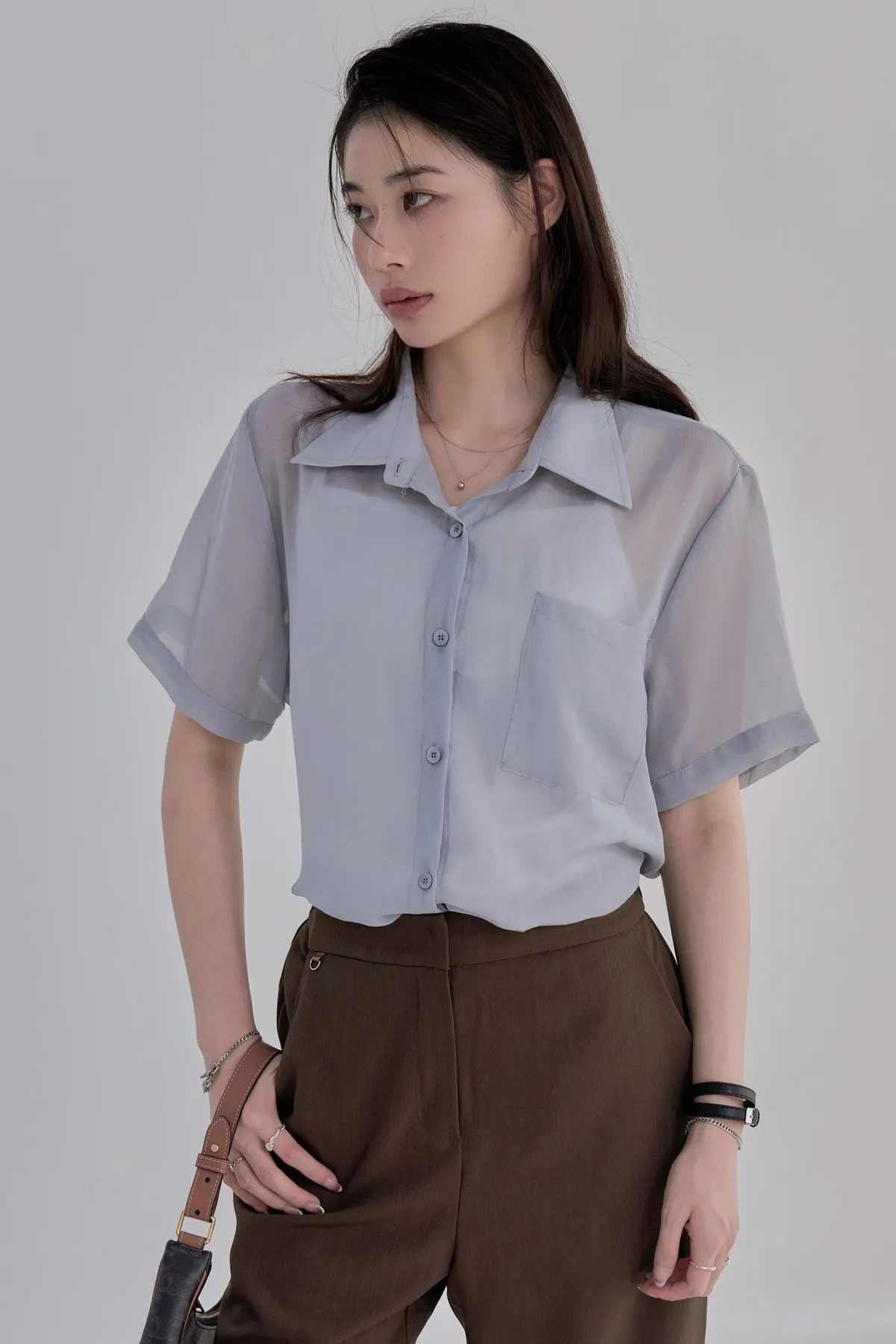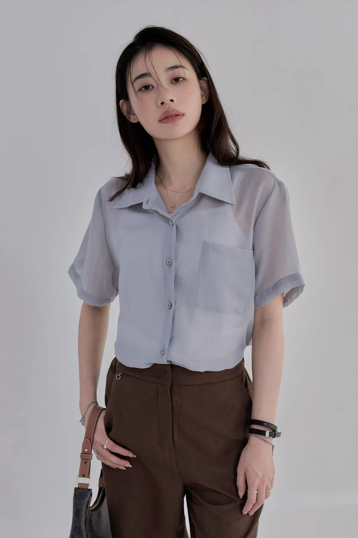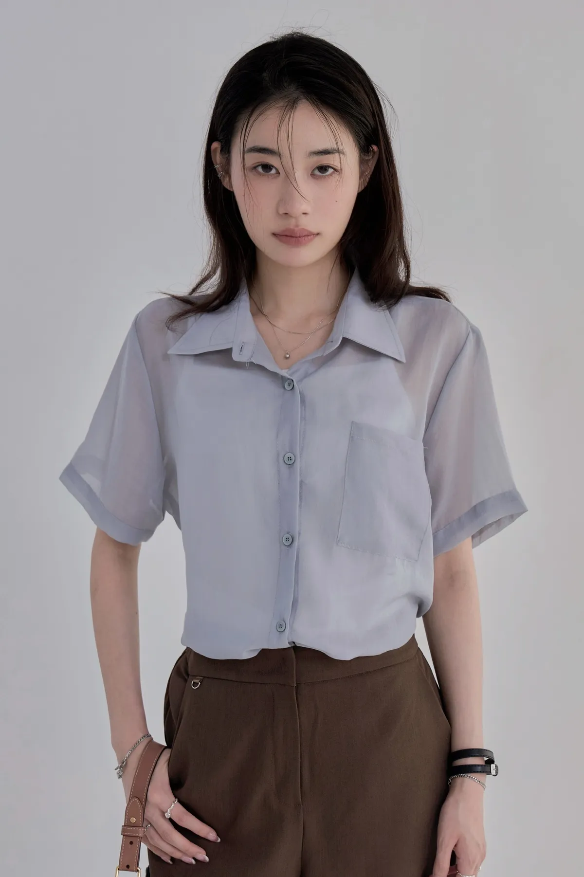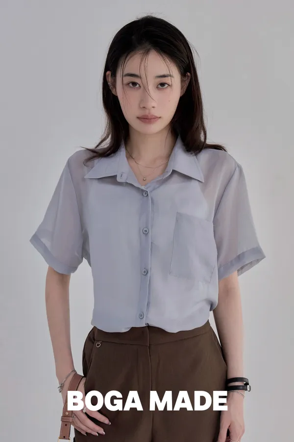 「BOGAMADE」無重力透膚綁帶襯衫.灰藍