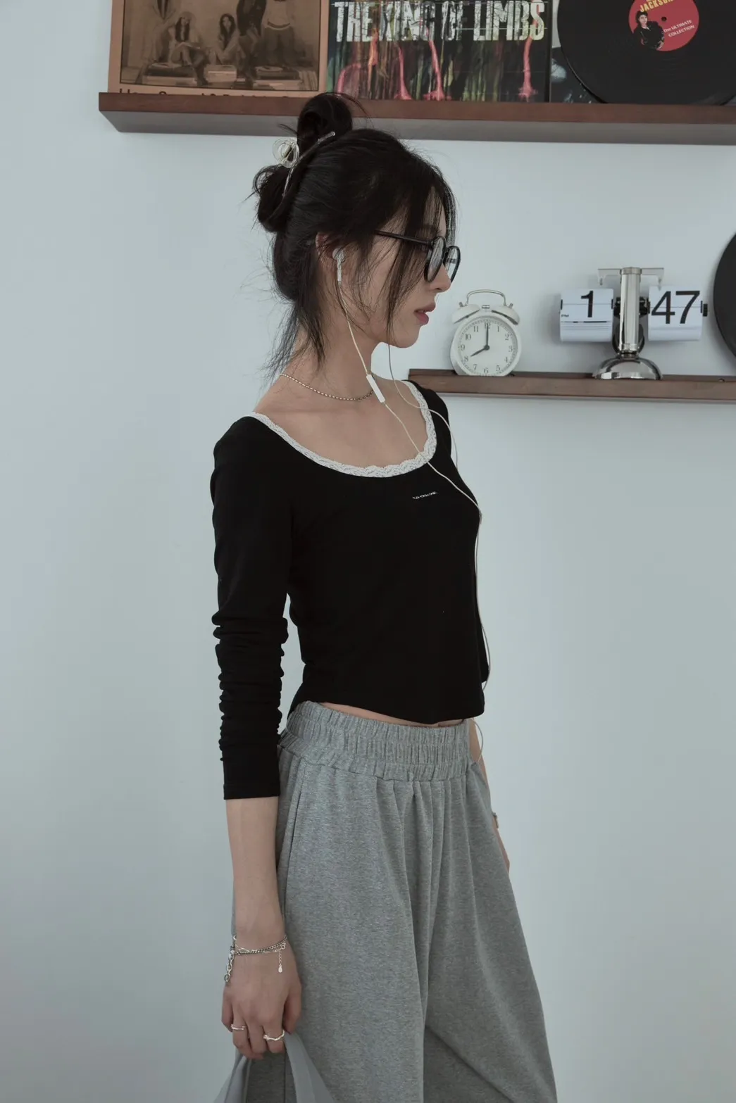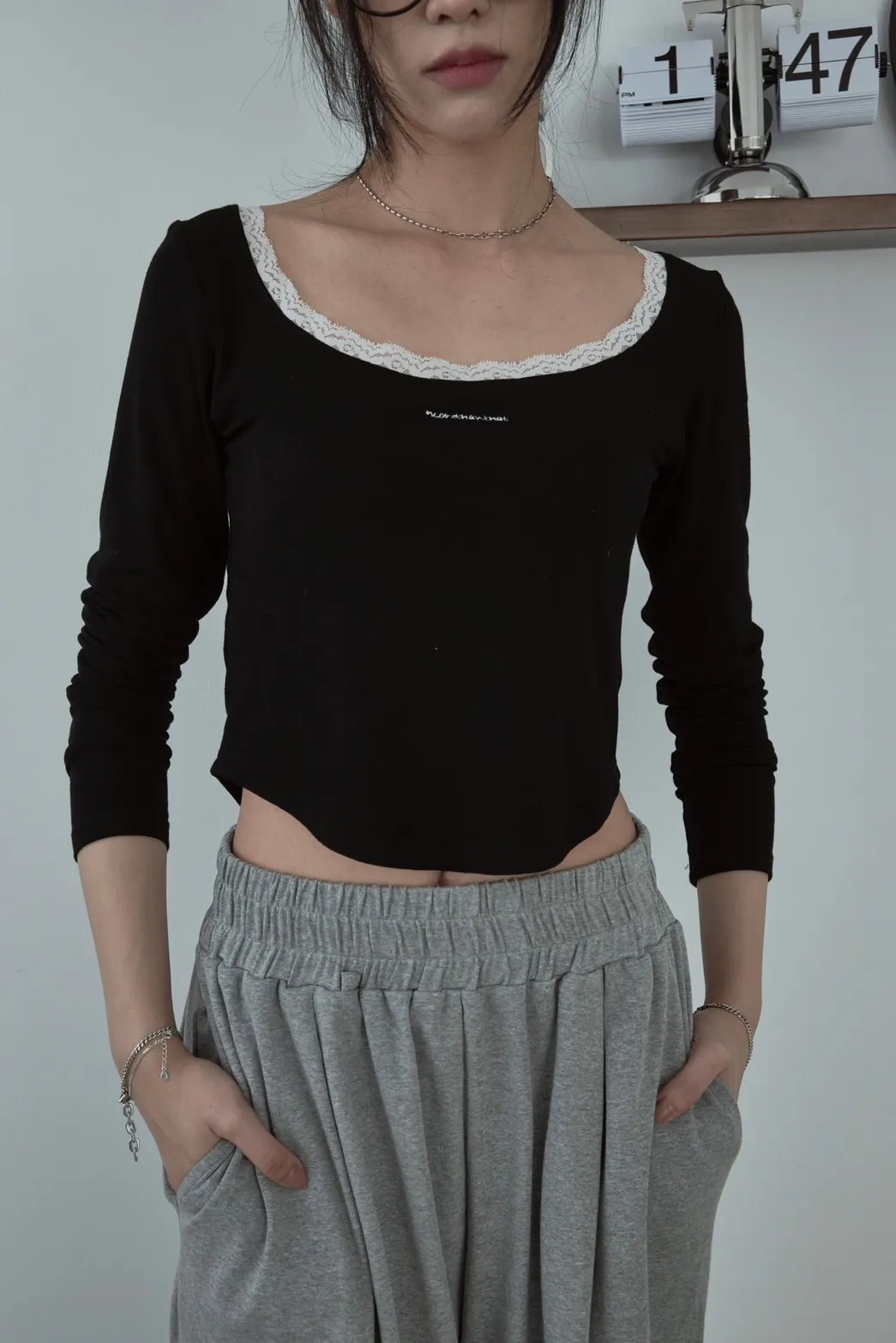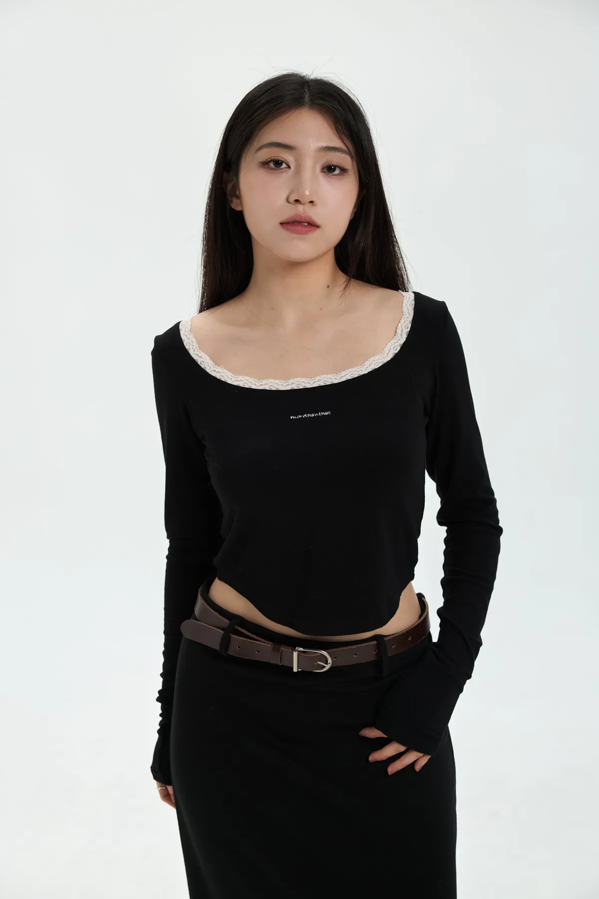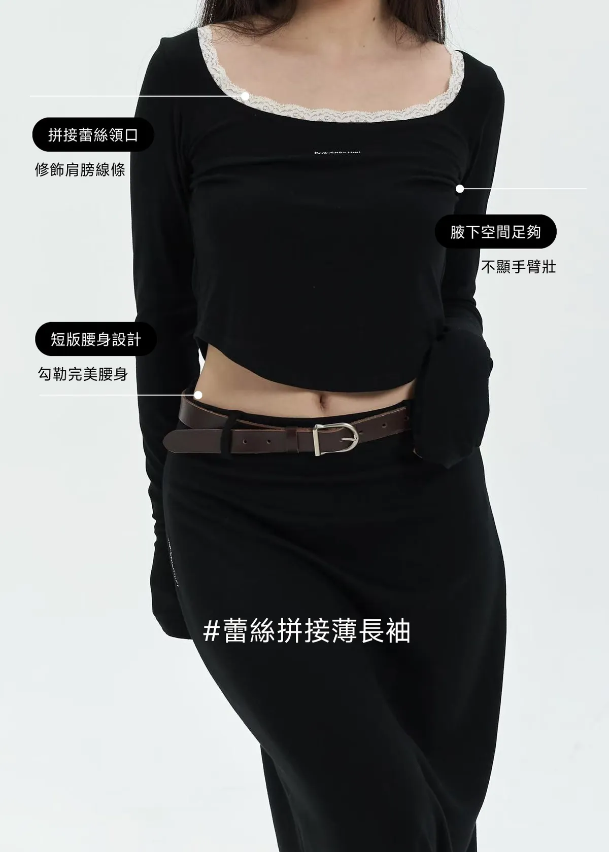 「BOGAMADE」領口拼接蕾絲薄長袖.黑