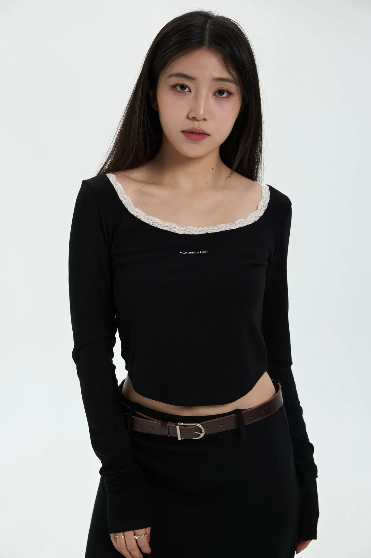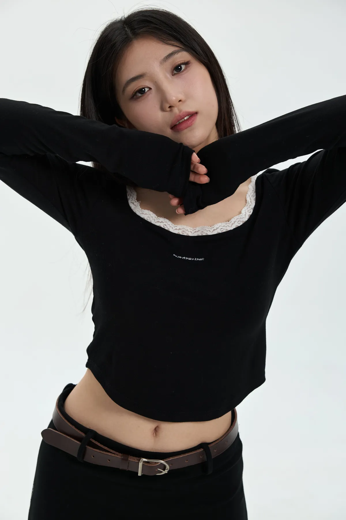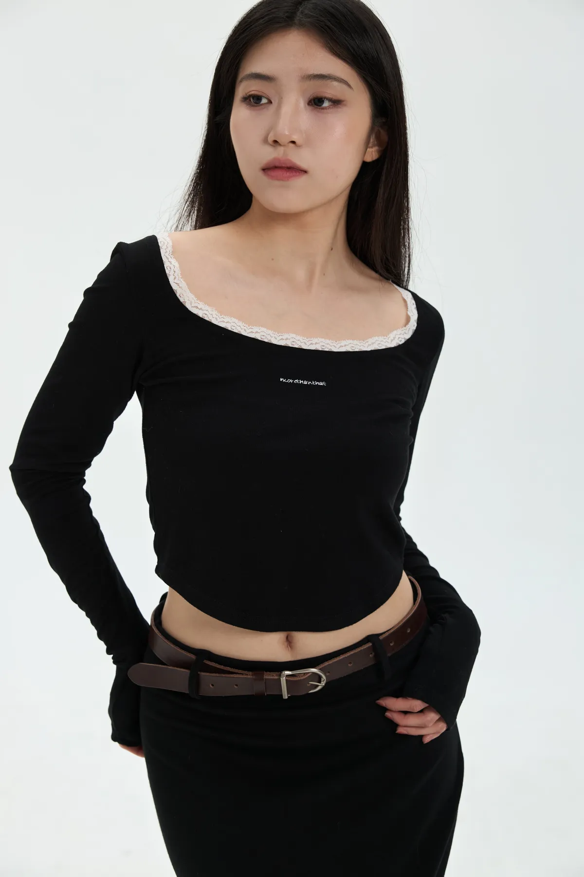 「BOGAMADE」領口拼接蕾絲薄長袖.黑