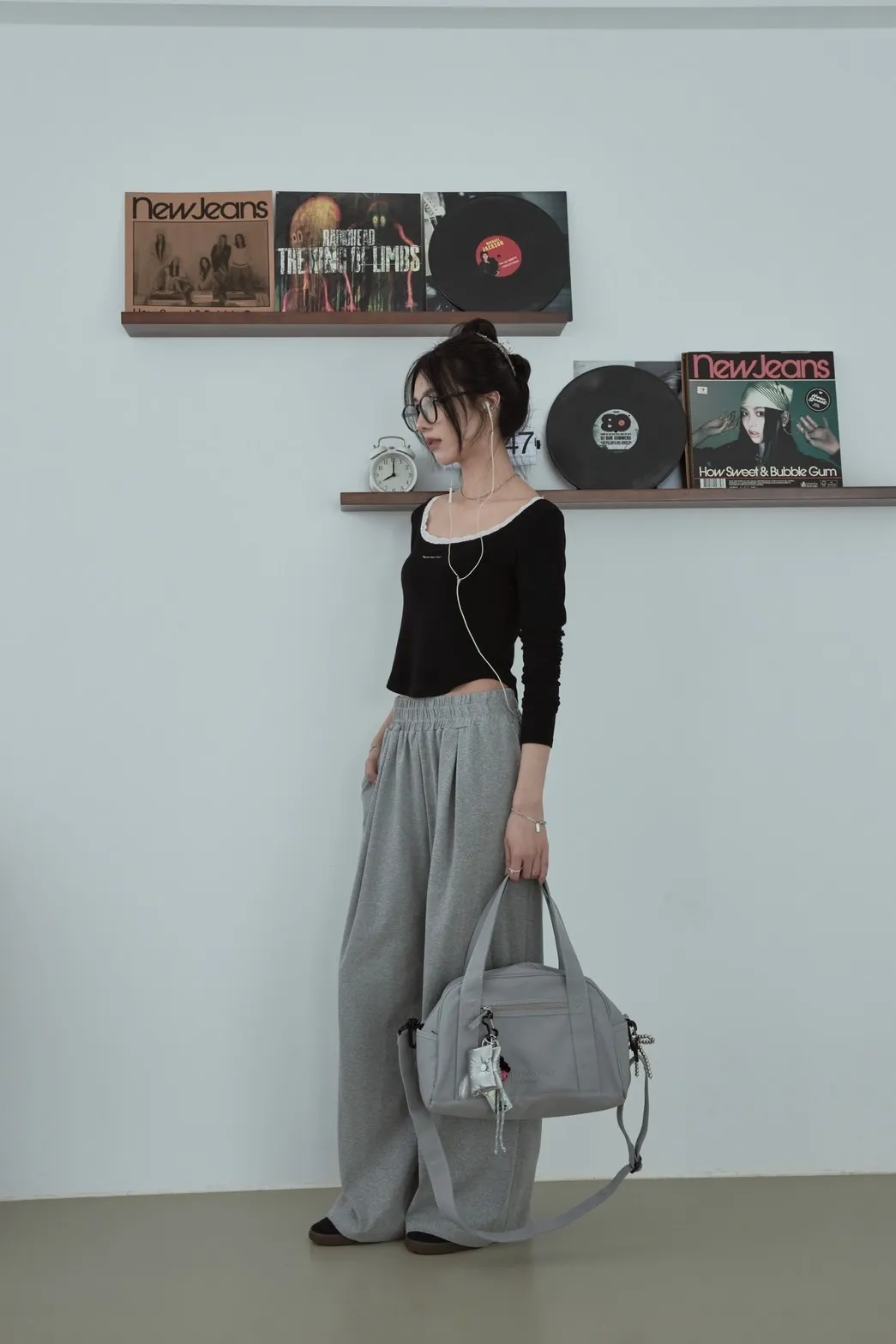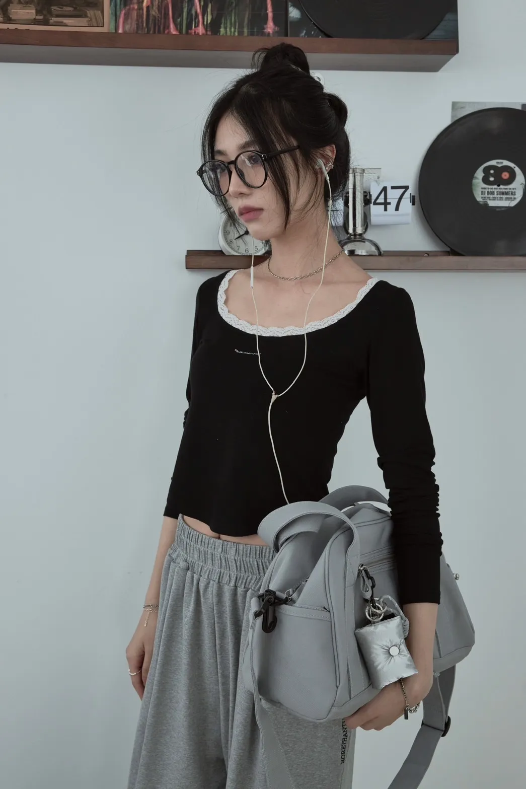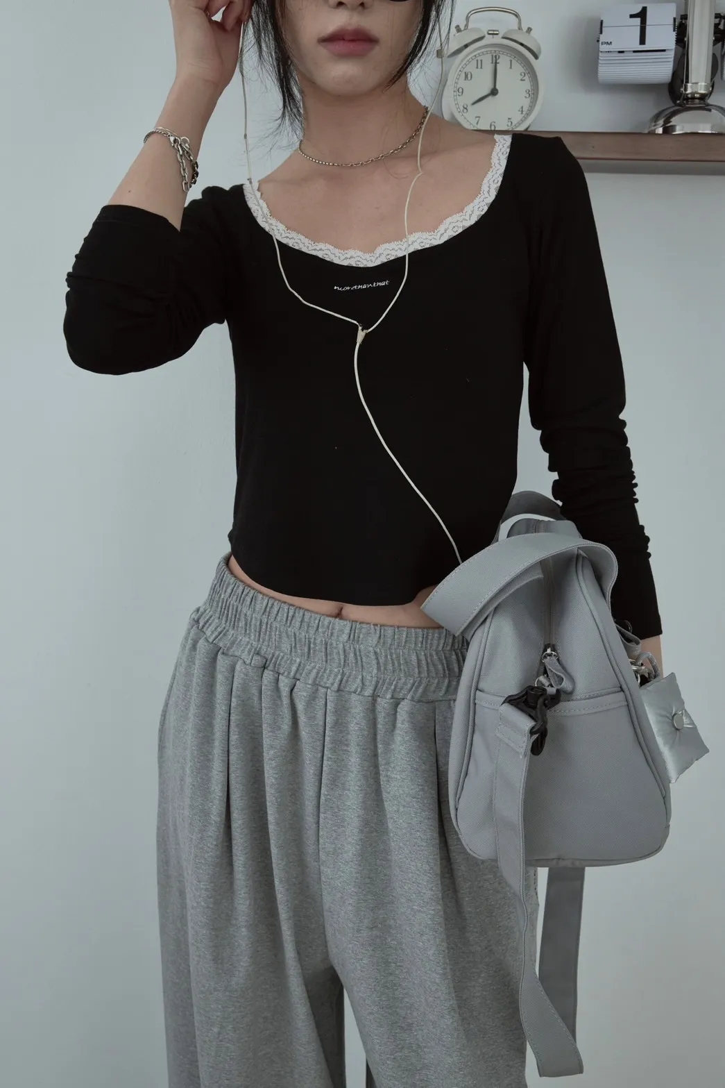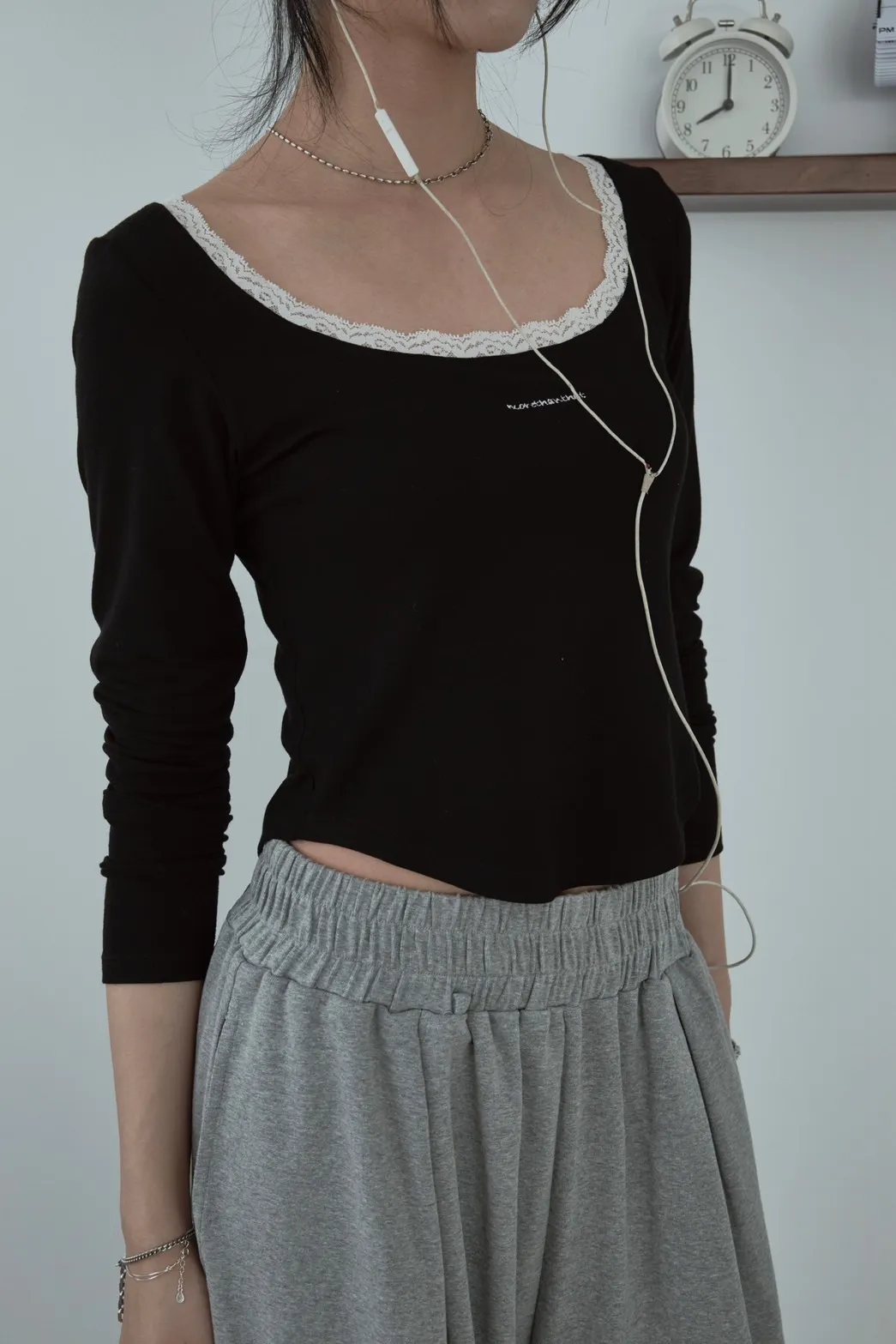 「BOGAMADE」領口拼接蕾絲薄長袖.黑