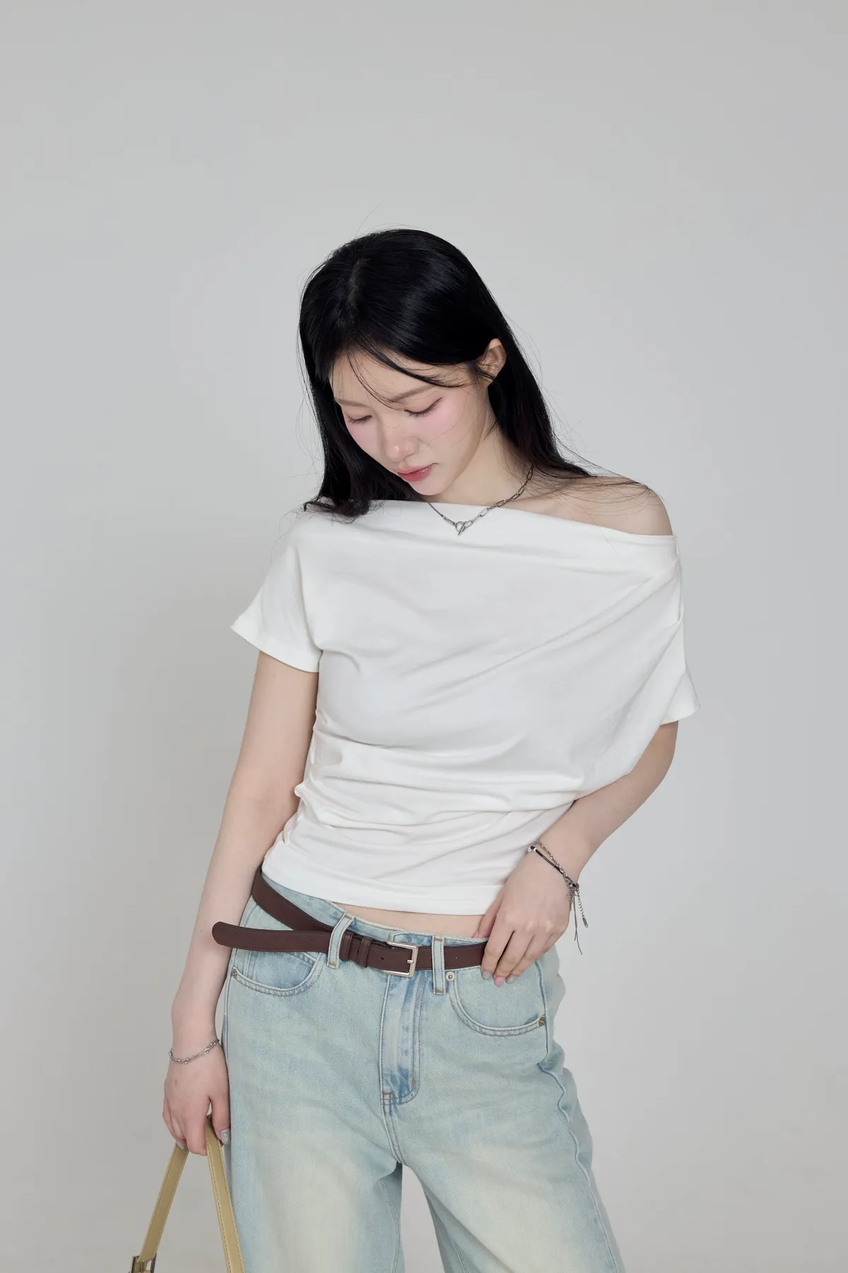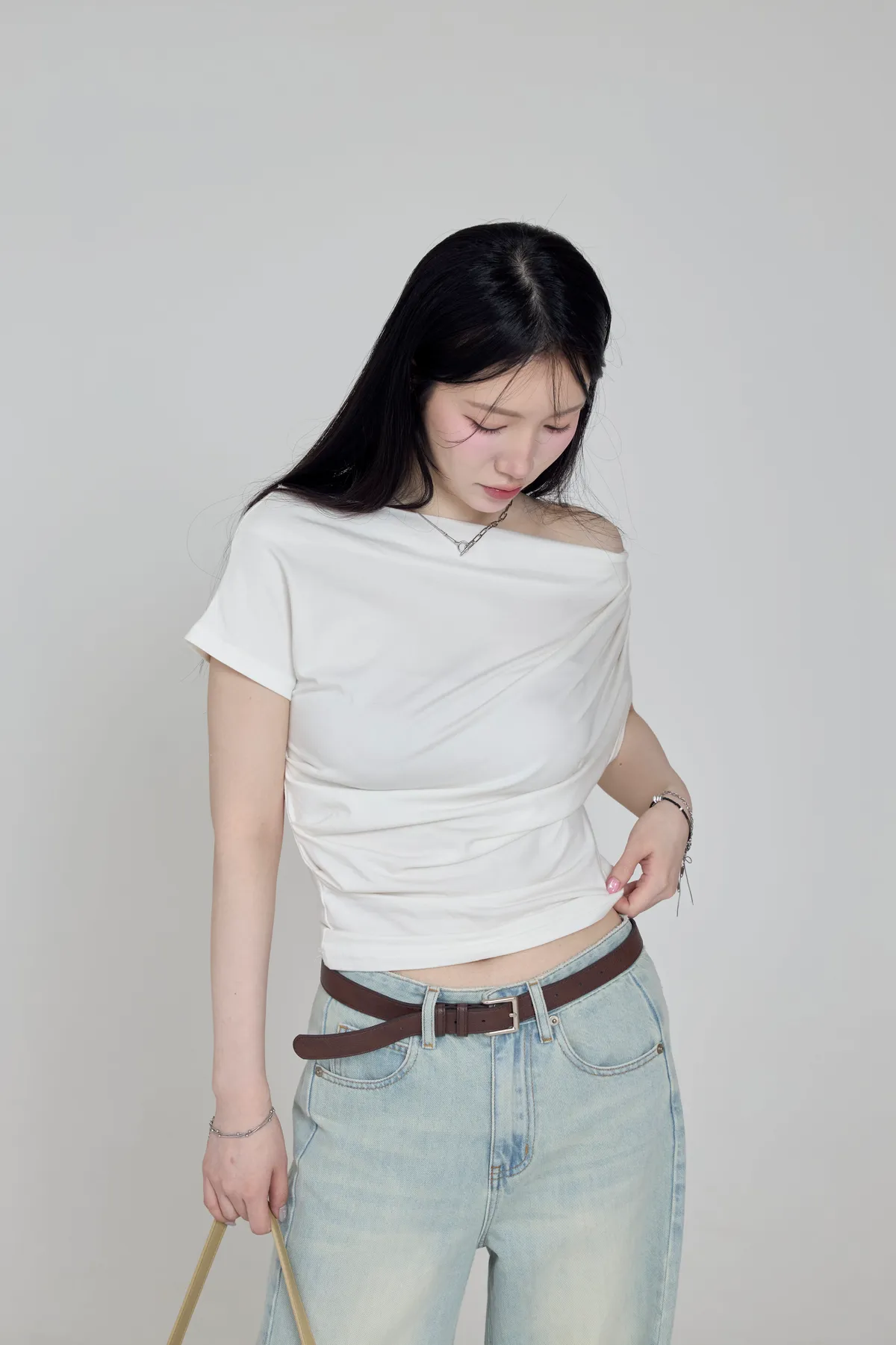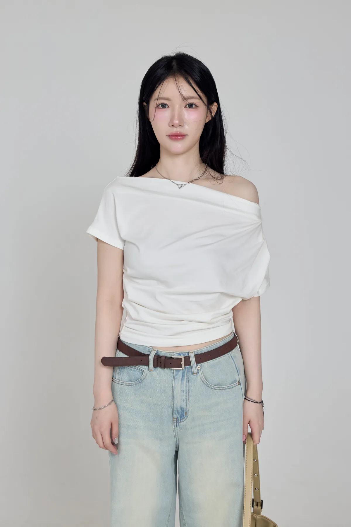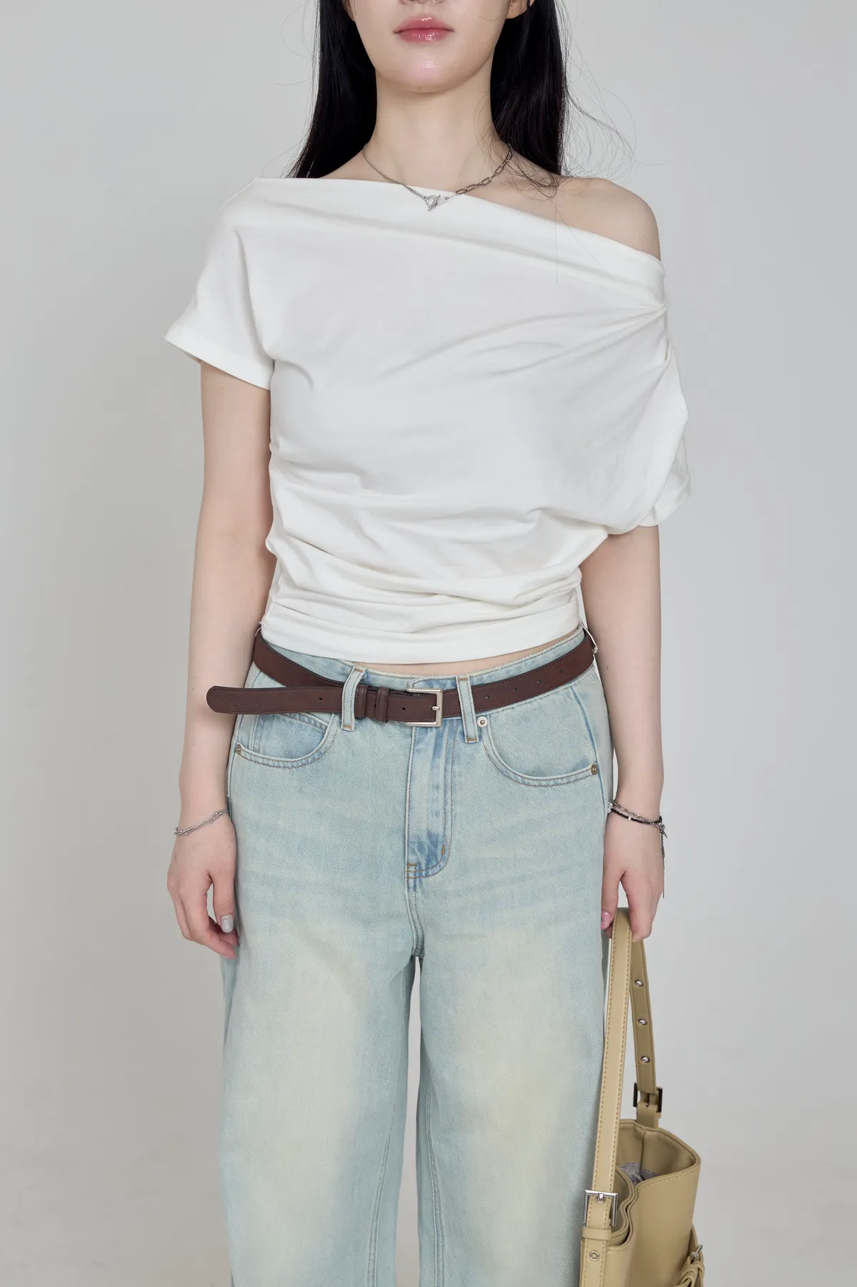 「BOGAMADE」斜肩抓皺上衣,白