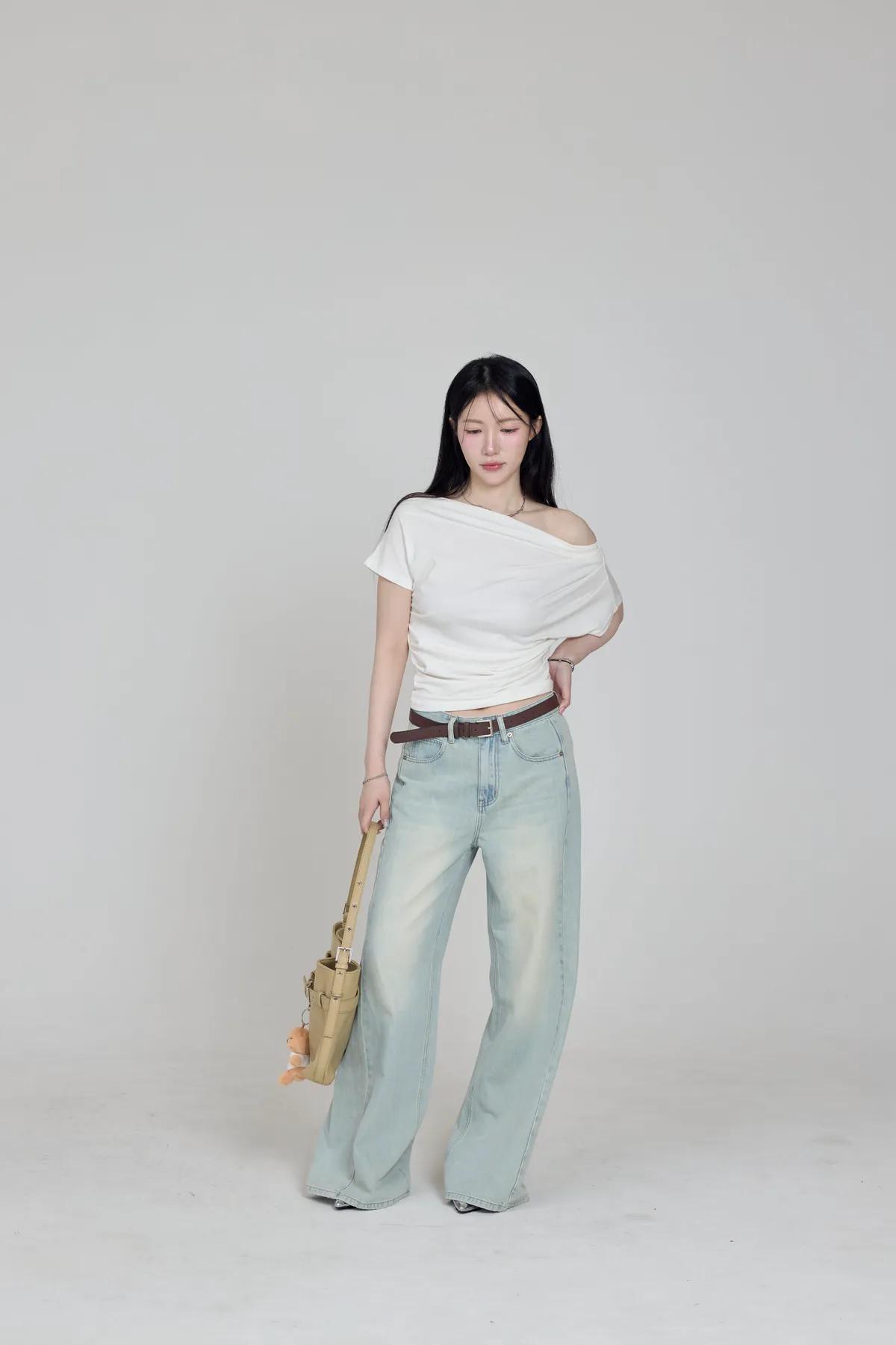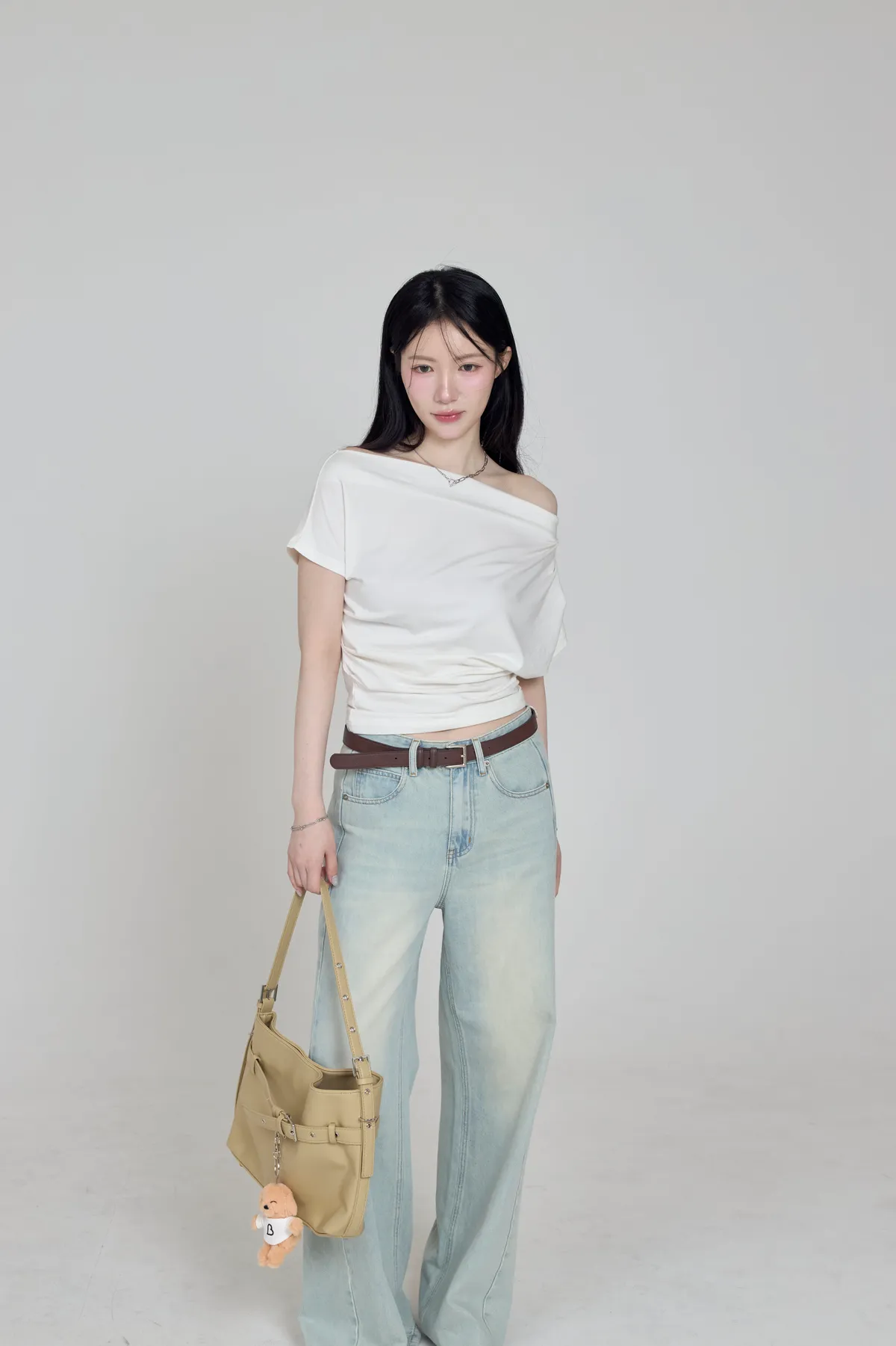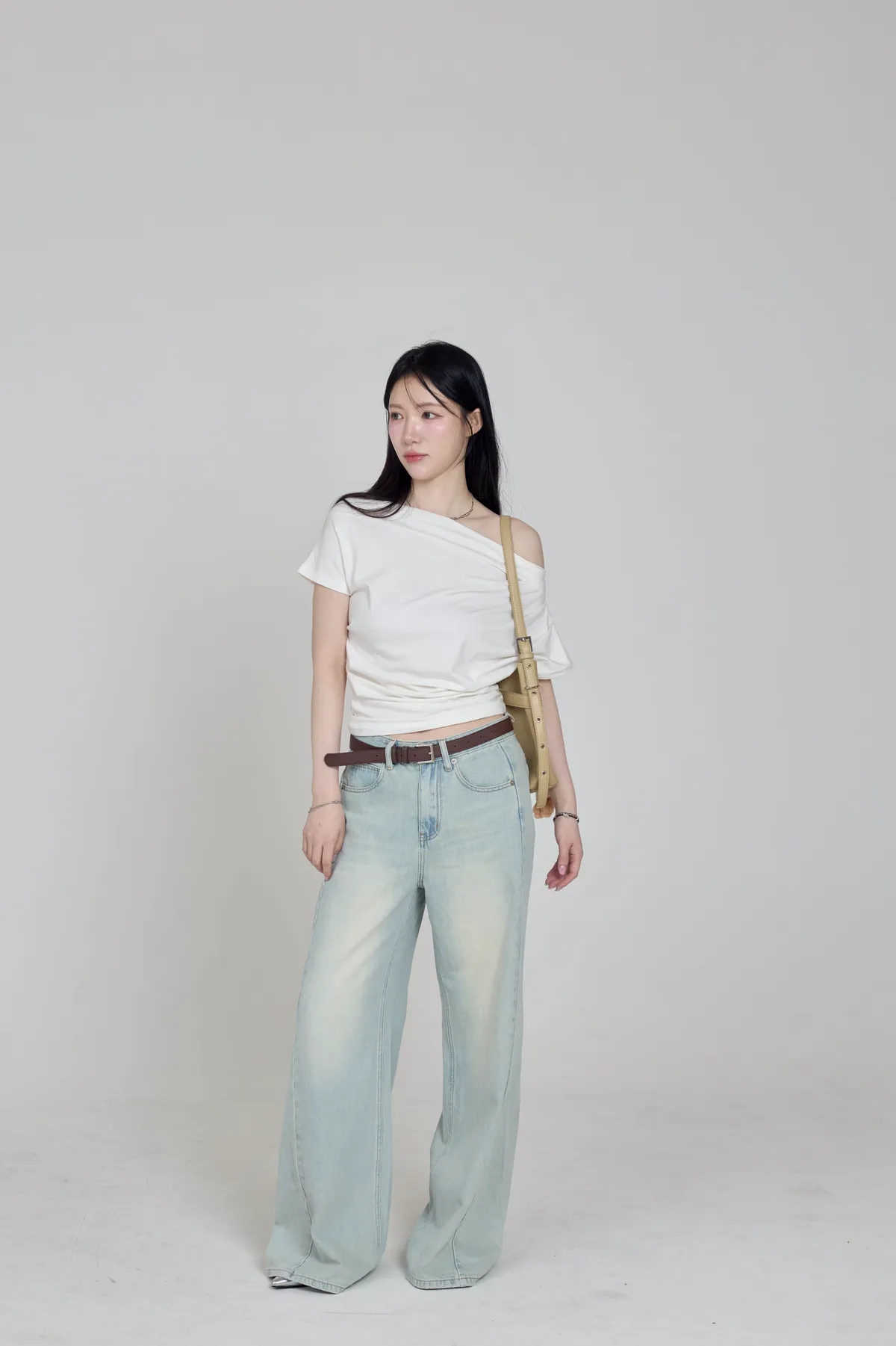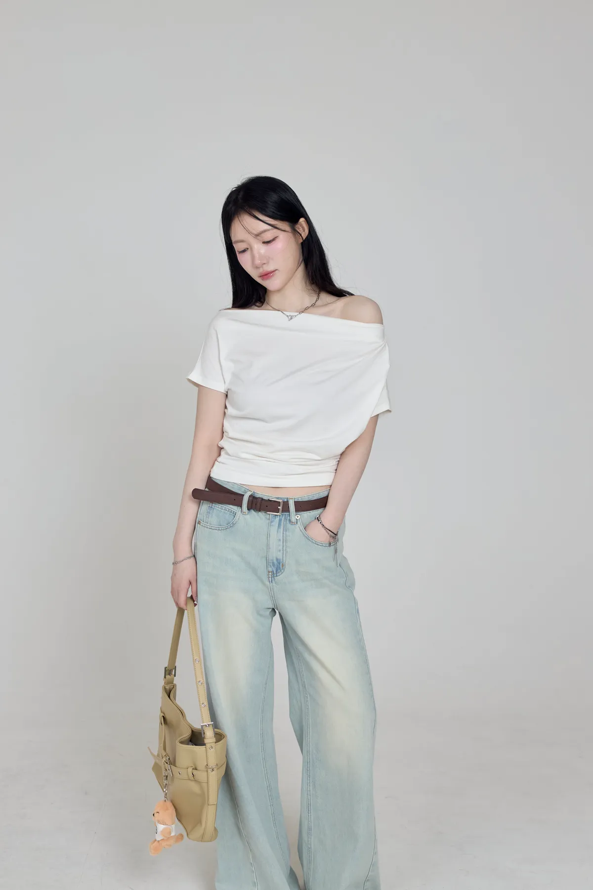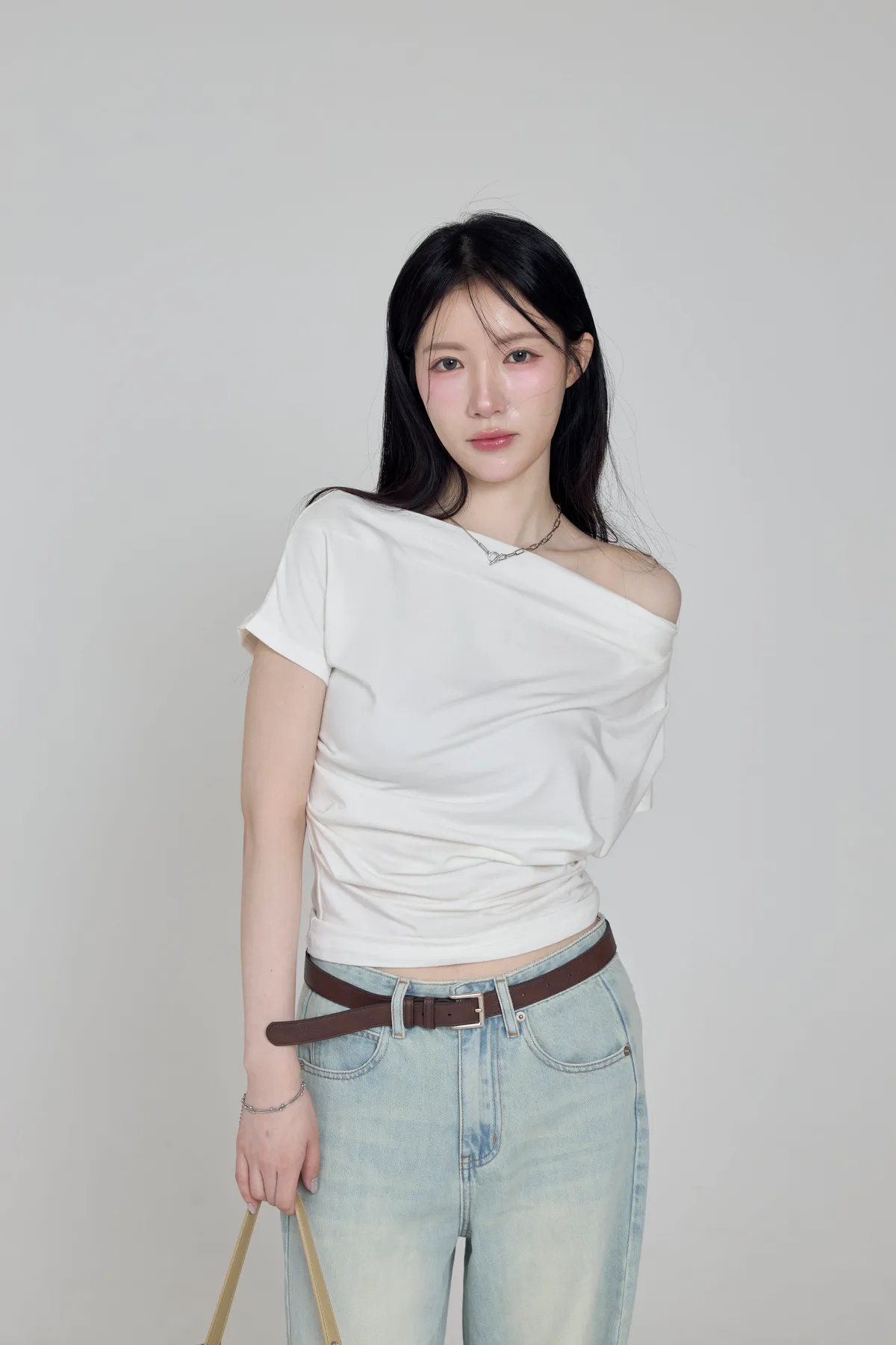 「BOGAMADE」斜肩抓皺上衣,白