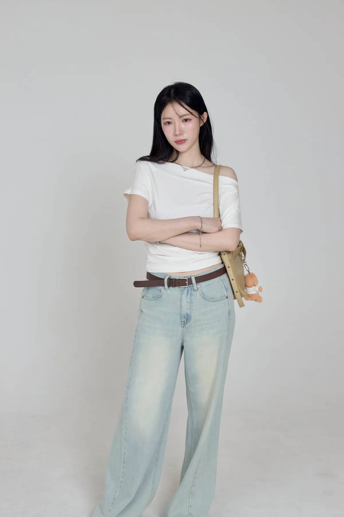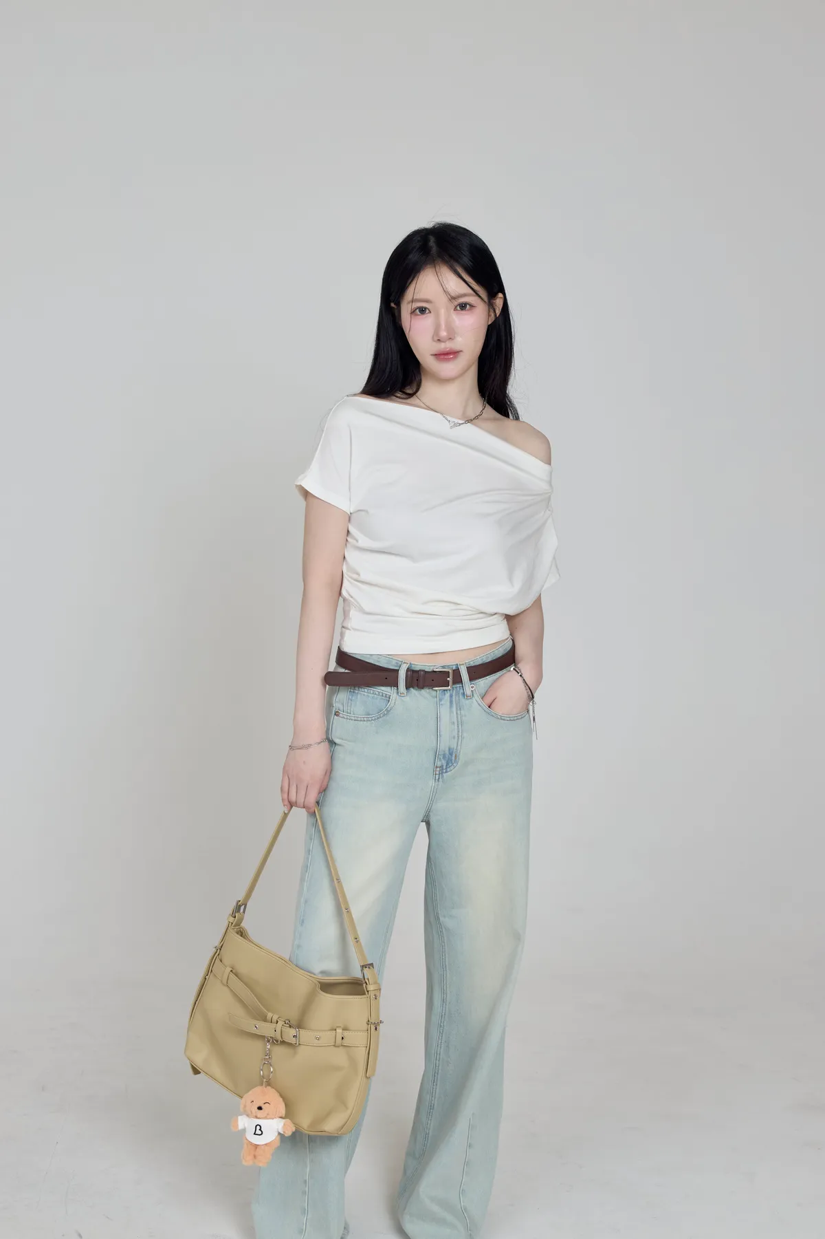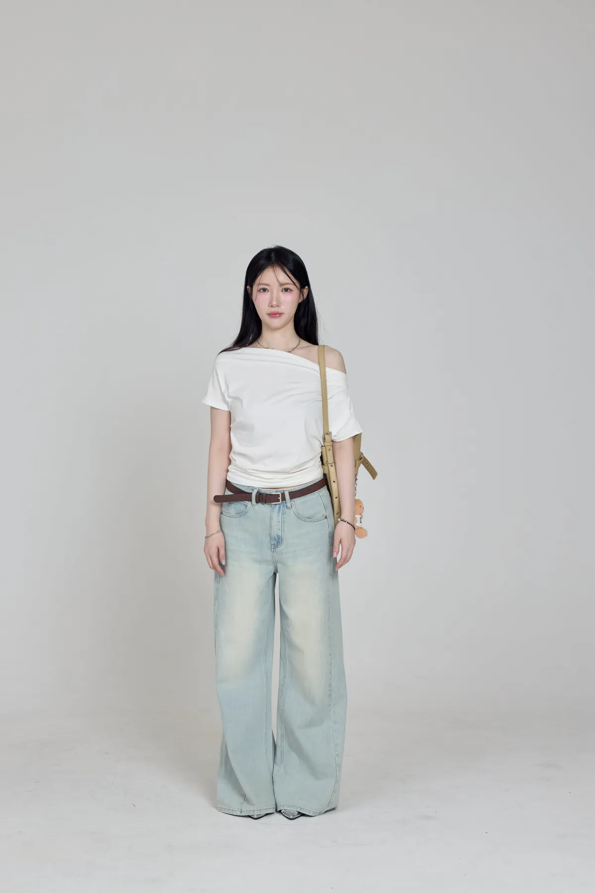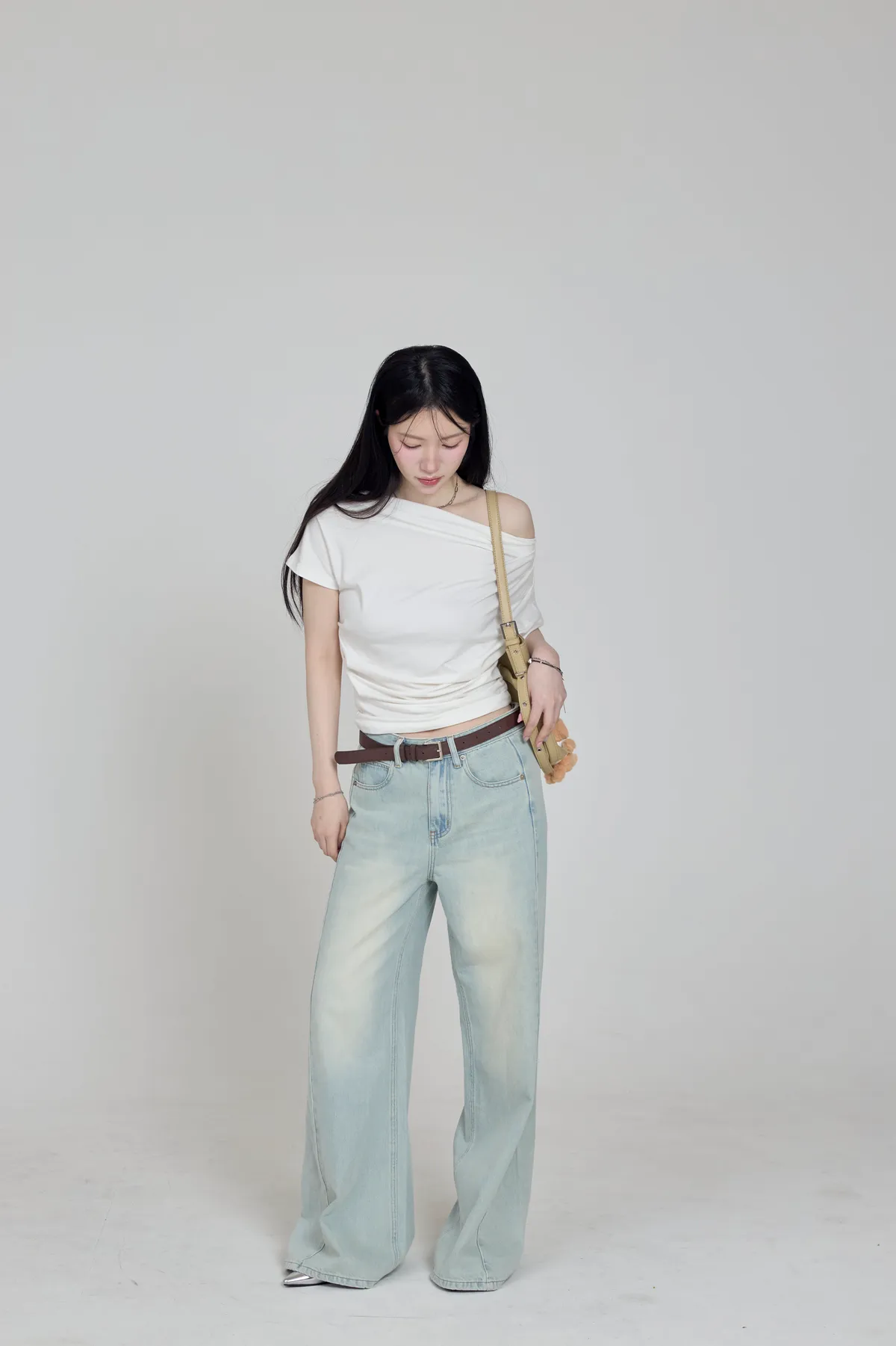 「BOGAMADE」斜肩抓皺上衣,白