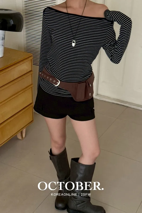 許我耀眼條紋斜肩上衣.黑