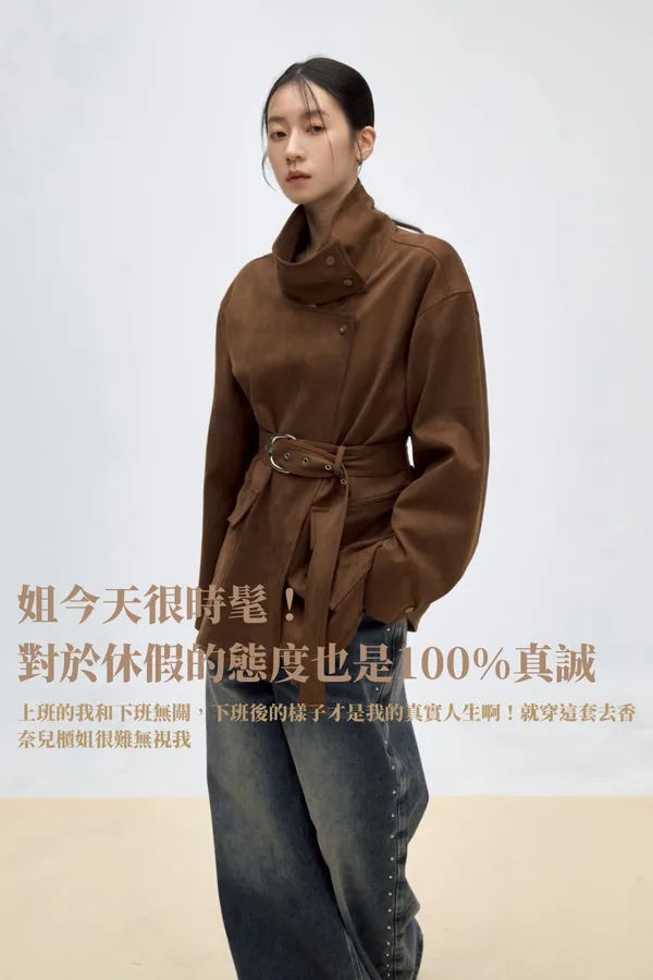 so:e 搭選|深焙可可麂皮立領、卯釘牛仔褲